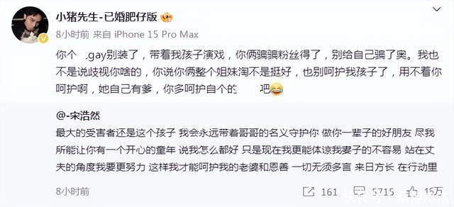 宋浩然和小猪先生隔空对呛,小猪先生的现任兜儿力挺老公对抗,她的主要指标是为了澄澈我方并未参加韩安冉的婚配。兜儿晒出小猪的分别证,解说我方是在小猪终末一次分别之后和他树立的恋爱关联,还称我方这些年际遇了好多网暴,以至我方的儿子还遭到了顽皮的挫折,我方目下无法容忍,要站出来不异我方的职权。