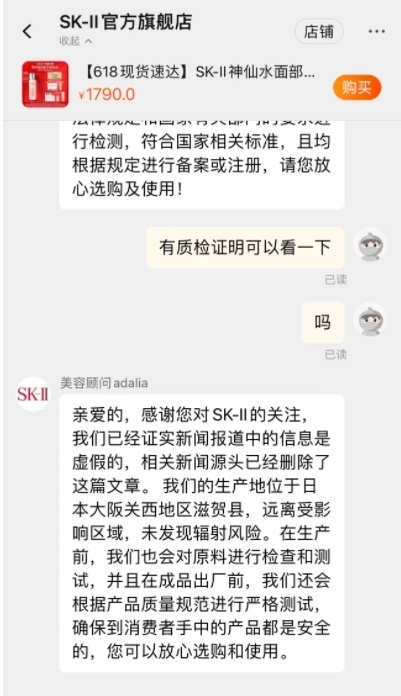 与此同期,21世纪经济报说念记者以虚耗者身份就相关问题向淘宝SK-II官方旗舰店的客服进行盘考,客服把柄宝洁公司的声明对关系质疑作念出明确复兴,标明店内在售的商品一齐经国度相关部门检会后正当合规。官方客服同期强调,新闻报说念中的信息是短处的已被删除,SK-II的出产地远隔辐射受影响区域,主顾不错缓慢选购商品。